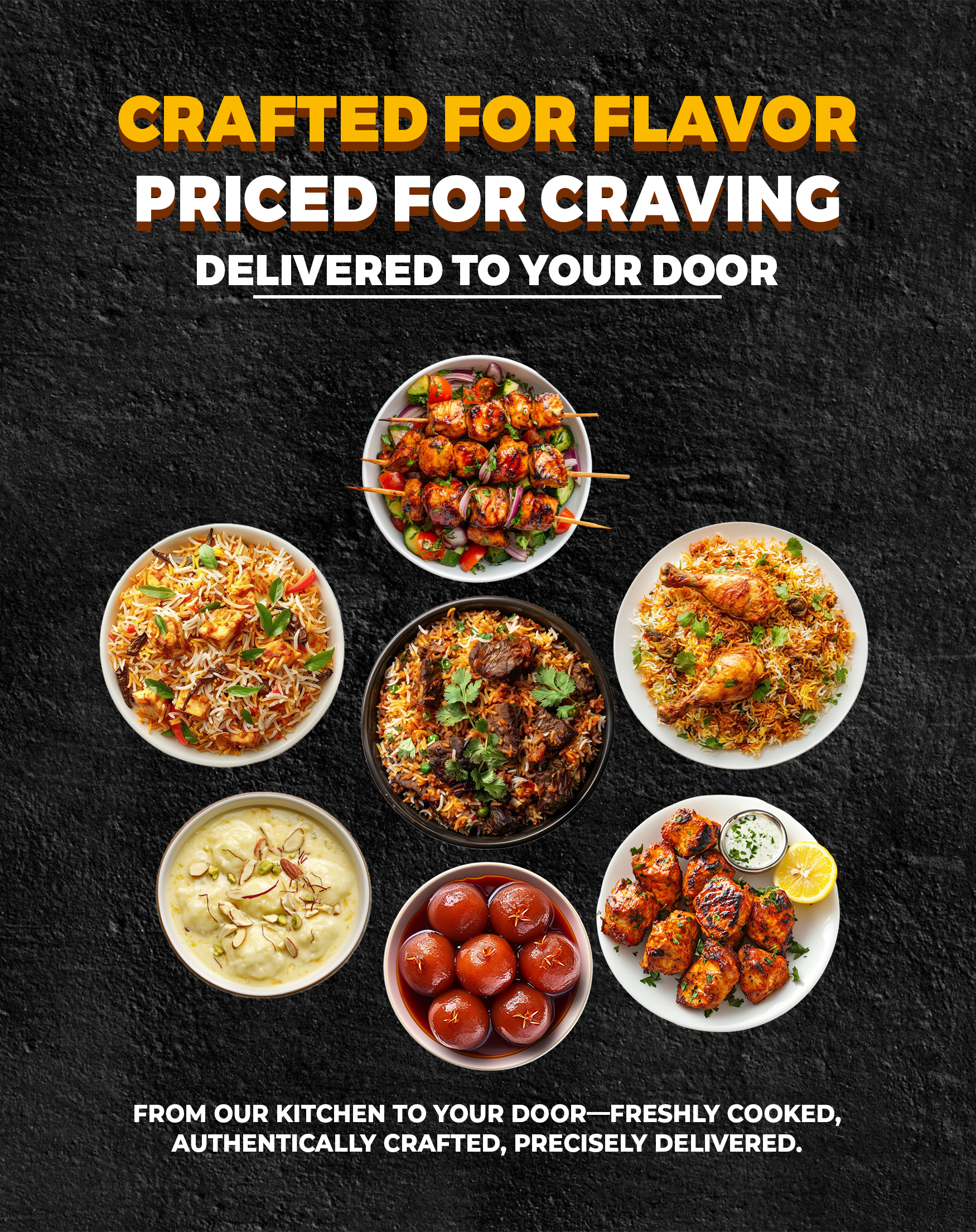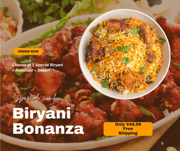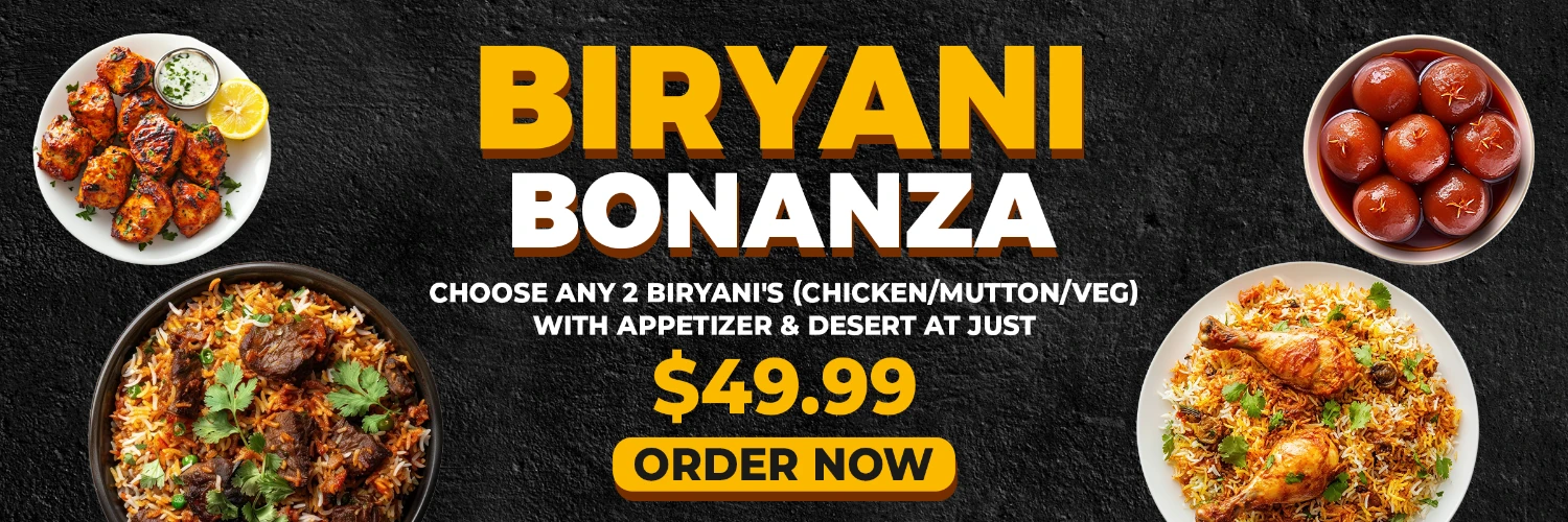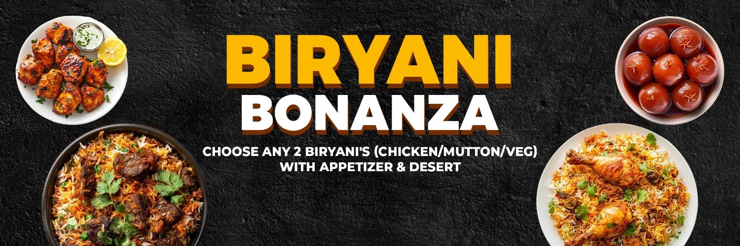 Choose 2 Biryani’s with Appetizer and Dessert which can serve for a family of 3-4